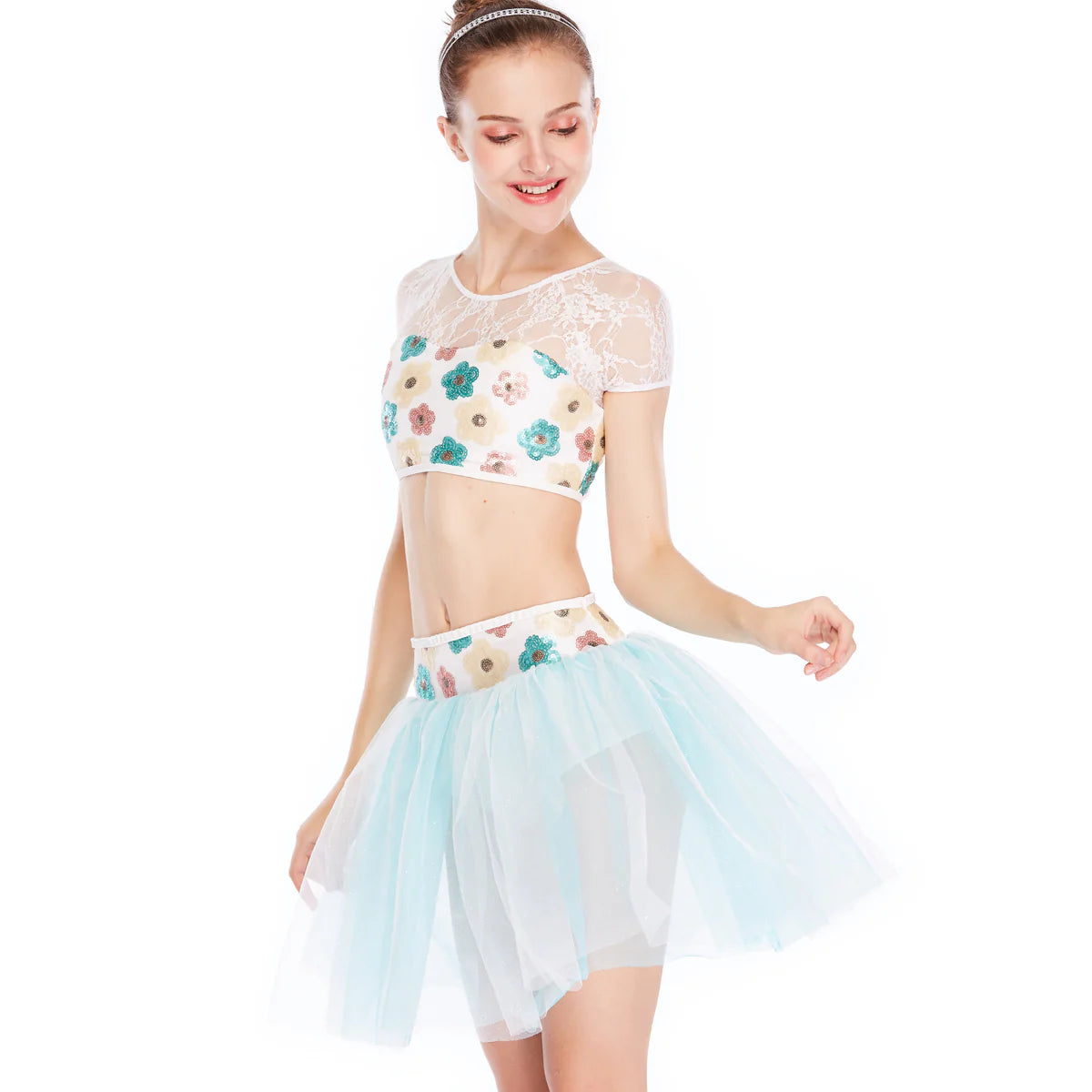 - Details: Flower Sequin Crop Top With Shiny Mesh Skirt