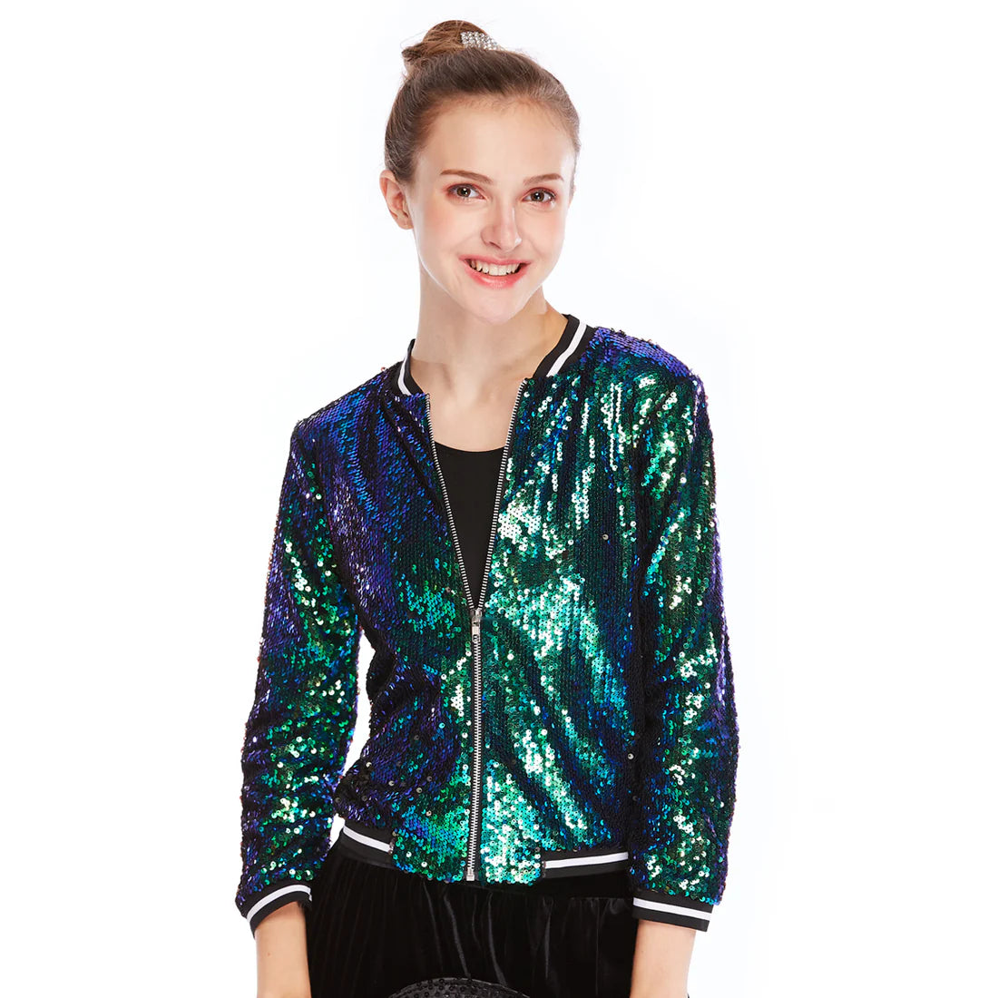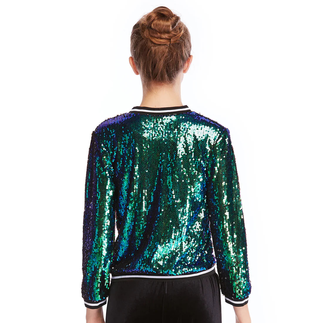 - Details: Elastic fabrics are used at the shoulders, hem and cuffs to reduce skin damage caused by sequins